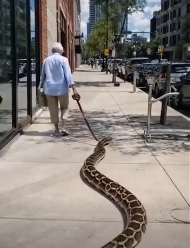 - U centru grada, jednog popodneva oko 14:30, sedamdesetogodišnja žena je šetala ulicom, držeći na povodcu velikog pitona. To nije bio pas, već egzotična zmija koja je izazvala šok među prolaznicima. Dok su jedni u panici sklanjali pogled, drugi su vadili telefone da snime nesvakidašnji prizor, a neki su čak pozivali i policiju, zabrinuti za sigurnost u takvoj situaciji. Međutim, žena je hodala smireno i sigurno, kao da je sa zmijom već uobičajeni prizor. Piton je išao uz njene noge, bez ikakvih znakova agresije. Bio je miran, što je za mnoge prisutne bilo zbunjujuće. Ovaj prizor nije izazvao paniku samo kod prolaznika, već i kod samih policajaca, koji su dolaskom na mesto očekivali da se situacija razvije u nešto mnogo dramatičnije.