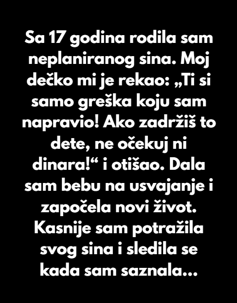 - „Ti si samo greška koju sam napravio, i ako zadržiš to dete, sama si — ne očekuj ni dinara ni sekundu mog života“ — ove reči su joj duboko urezane u pamćenje, ostavivši je bez ikakvih prava ili prava na podršku. Odrasla, suočena s teškom situacijom, donela je mučnu odluku da da svog sina na usvajanje. Nije bilo lako, ali verovala je da je to jedini izlaz za nju, želeći početak bez stresa i bola. Kasnije je pronašla stabilnost u braku sa starijim partnerom, koji je pružio sigurno okruženje, ali duboka tuga zbog gubitka sina nije prestajala.