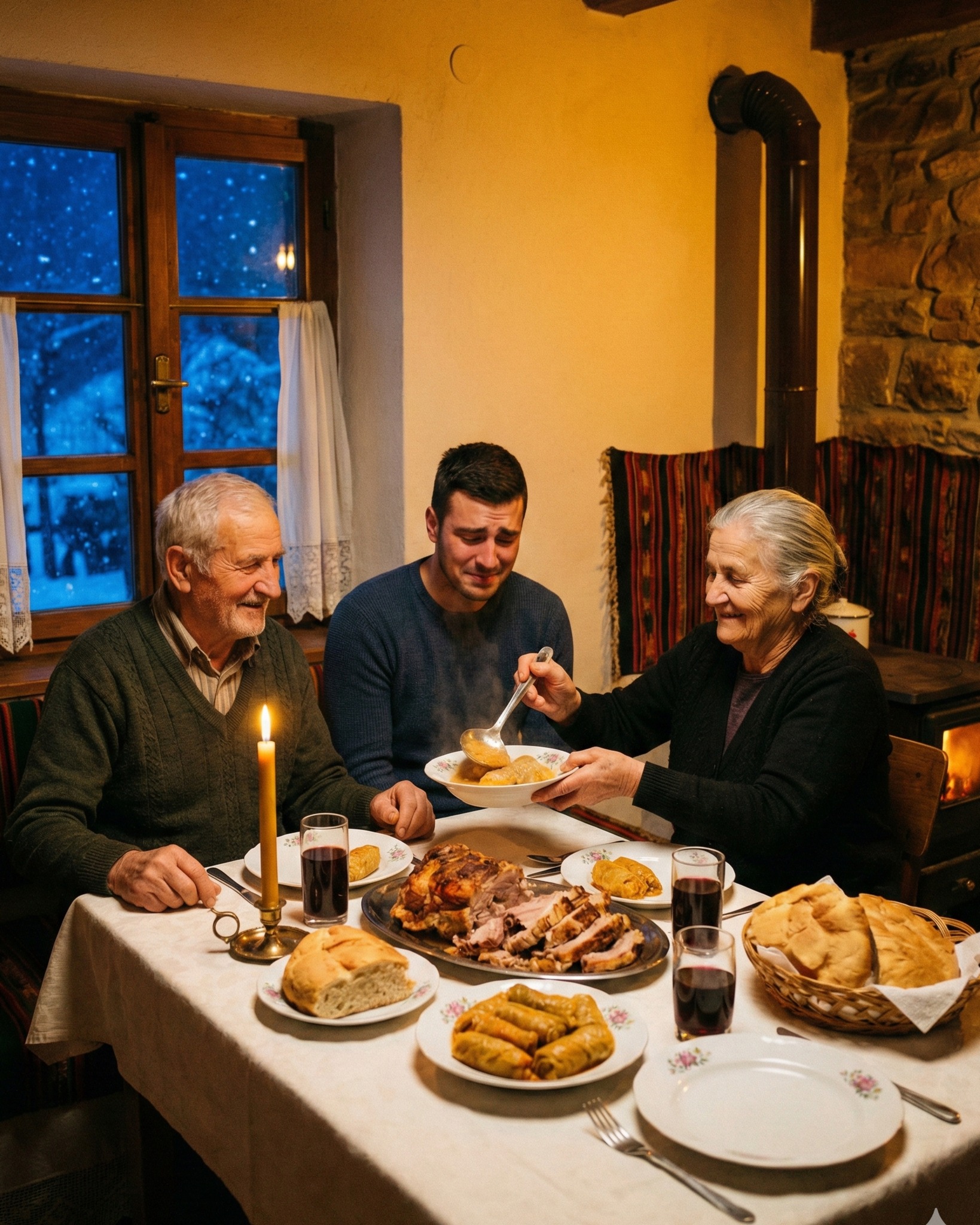 - U toj zimskoj tišini, u kući Lazara i Milice, sve je bilo spremno za slavlje Svetog Nikole, njihove krsne slave. Spremali su se za doček sina Dragana i unuka Stefana, ali su ujedno osećali zebnju zbog snežne mećave koja je pretila da im onemogući da okupe porodicu. Kuća je bila prepunjena mirisima slavske trpeze, ali tog dana, kroz iznenadni poziv saznali su da njihova deca neće moći da dođu zbog zastoja na putu. Taj trenutak tišine i gubitka nade brzo je prešao u samoću, kada su se Lazar i Milica našli pred praznim stolom, sa svim pripremama koje su ostale nedovršene.
