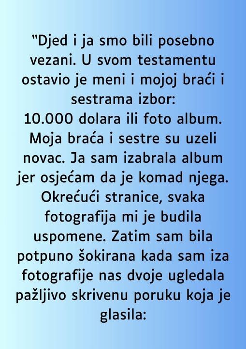 - Okrećući stranice, svaki trenutak, svaka fotografija budila je uspomene na djetinjstvo, na one trenutke kada su zajedno provodili vrijeme, smijali se i stvarali uspomene koje bi trajale zauvijek. Međutim, dok je pregledavala jednu od stranica, nešto je zaintrigiralo njezinu pažnju. Ispod jedne od slika bila je pažljivo skrivena poruka. Unuka ju je otvorila, a ono što je pročitala potpuno ju je šokiralo. U pismu je djed ostavio ček na 100.000 dolara, uz objašnjenje da je to njegov posljednji dar za nju. Dar koji nije bio samo materijalan, već emocionalan – jer je djed znao da će ona izabrati uspomene.