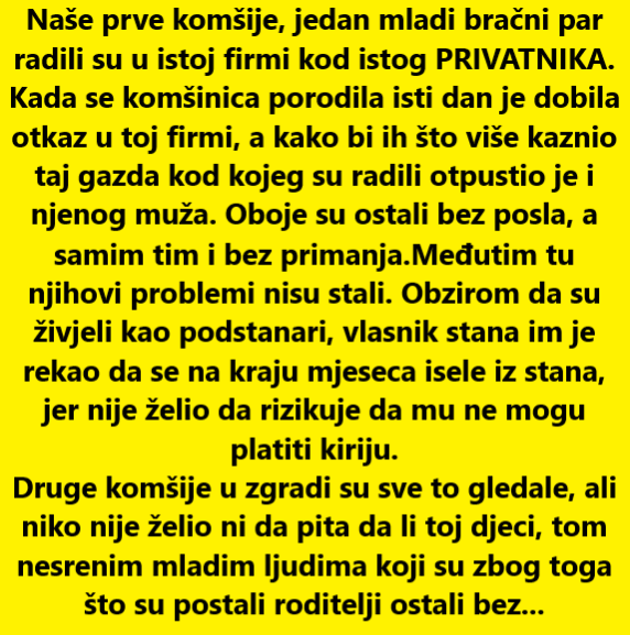 Kao da to nije bilo dovoljno, stigao je još jedan udarac. Stanodavac, kod kojeg su plaćali kiriju, obavijestio ih je da na kraju mjeseca moraju napustiti stan. Nije želio rizikovati da mu ne mogu plaćati stanarinu. Tako su, osim što su ostali bez prihoda, mladi roditelji s bebom ostali i bez krova nad glavom. Komšije iz zgrade sve su to posmatrale, ali niko nije pokazao spremnost ni da pita da li im treba pomoć, a kamoli da im pruži konkretnu podršku.