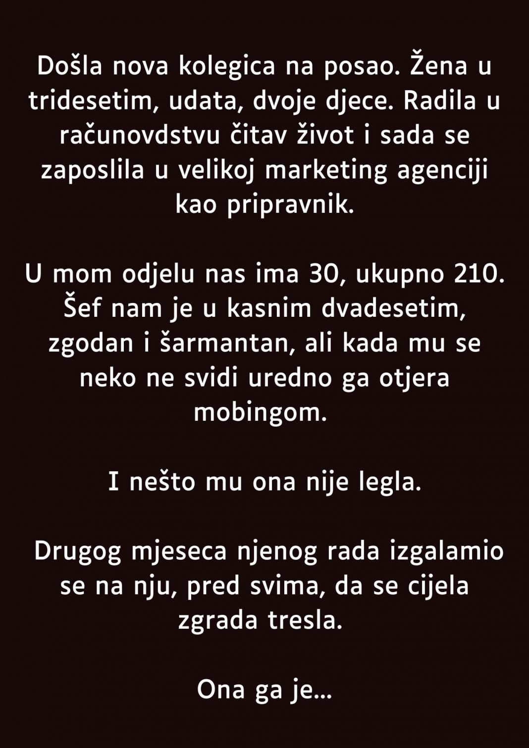 - Nova kolegica pojavila se bez pompe. Nije bila nametljiva, nije se trudila da se svidi svima, ali je od prvog dana zračila nekom tihom sigurnošću. U firmi u kojoj su zaposleni godinama navikli na strogu hijerarhiju i šefove ispade, ona je bila neko ko se uklapao, ali se nije gubio. Radila je svoj posao fokusirano, učila brzo i nije ostavljala utisak osobe koju je lako zastrašiti.