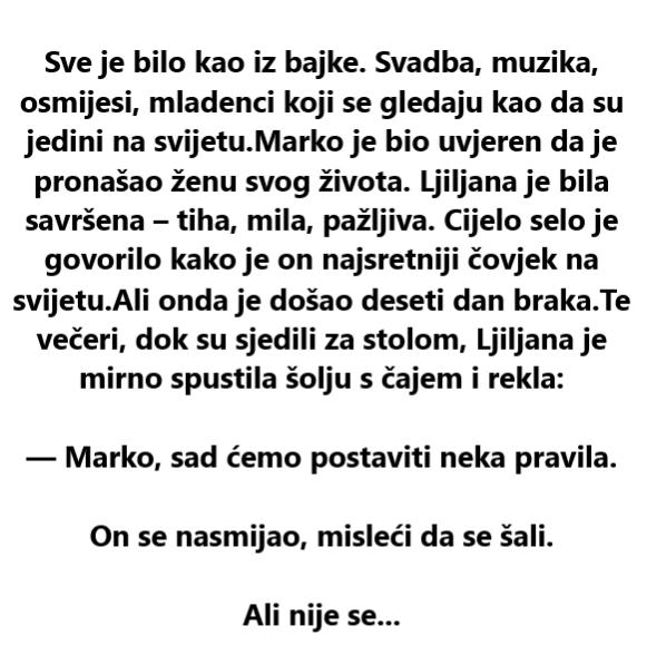 Na početku je sve izgledalo kao san. Svadba koja je okupila cijelo selo, muzika koja je odzvanjala do jutra, osmijesi na svakom koraku, a mladenci koji su se gledali kao da niko drugi na svijetu ne postoji. Marko je bio uvjeren da je pronašao svoju srodnu dušu, ženu s kojom će dijeliti život u ljubavi i miru. Ljiljana je djelovala savršeno – tiha, mila, pažljiva. Svi su govorili da je on najsretniji čovjek na svijetu i da mu je sudbina podarila nešto posebno.