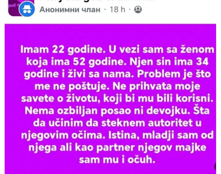 Mladić, koji je tek napunio 22 godine, našao se u vrlo specifičnoj situaciji. U vezi je sa ženom koja ima 52 godine, dok njen sin ima 34, što znači da je stariji od njega. Iako su ljubavni odnosi sa velikim razlikama u godinama sve češća pojava, ovaj mladić suočava se sa izazovom sticanja autoriteta kod svog partnerkinog sina, koji, kako tvrdi, njega ne doživljava kao ništa više od „uljeza“ u njihovom životu. Problem nije u emocijama, već u tome kako da se postavi kao očuh prema nekome ko je stariji, a i očigledno se ne slaže sa njegovim savetima. Mladić piše: “Nemam ozbiljan posao, niti devojku, a često osećam da ne poštuje moju poziciju u porodici.”