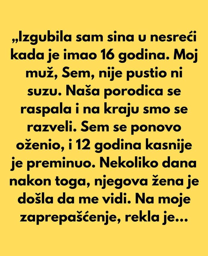 Žena koja stoji iza ove ispovesti godinama je nosila teret najveće moguće tragedije – gubitka deteta. Njen sin je stradao u saobraćajnoj nesreći sa svega 16 godina, ostavivši za sobom porodicu koja nikada više nije bila ista. Taj trenutak bio je prelomna tačka njenog života, ali i njenog braka. Dok je ona tonula u bol, njen tadašnji suprug Sem delovao je hladno, gotovo nepomično pred tragedijom. Nije pustio nijednu suzu, nije pokazao tugu onako kako se od oca očekuje. Ta tišina postala je nepremostiv jaz između njih.