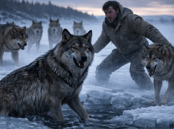 Na ledu je vidio vučicu, trudnu, kako se bori sa zaleđenom vodom. Njene šape su klizile po ivici leda, a svaki pokušaj da se popne, završavao je padom u vodu. Voda oko nje postajala je tamnija jer je njena dlaka prekrivala led, a njeni krikovi su odjekivali tišinom. Bilo je jasno da, zbog trudnoće, vučica nije mogla da se usmeri kao obično, a led je pucao pod njenim težinom.