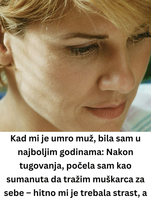 • I tada se desilo nešto što je iznenadilo i nju samu. Počela je da oseća potrebu za prisustvom muškarca. Ne za novom ljubavlju, ne za vezom, već za dodirom, mirisom i prisustvom muškog tela pored sebe. Kao da se u njoj otvorila praznina koja je tražila da bude ispunjena telesnom bliskošću, makar na trenutak. Sve što je do tada bilo vezano samo za njenog muža – poljubac, zagrljaj, intimnost – odjednom je postalo pitanje koje je tražilo odgovor: kako je to kada te dotakne neko drugi?
