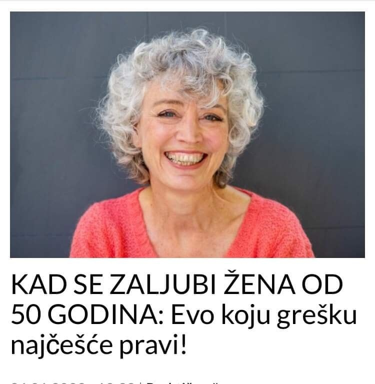 • Kaže stara poslovica: “Zaljubila se i poludjela.” I nekad se baš tako čini – žena koja je prešla pedesetu, a ponaša se kao djevojčica iz školskih klupa. Cvrkuta, hihće, koketira, mijenja frizuru svakih deset dana, nosi uske haljine koje joj ne pristaju i zaboravlja na svoju mudrost – onu životnu, skupljanu godinama.