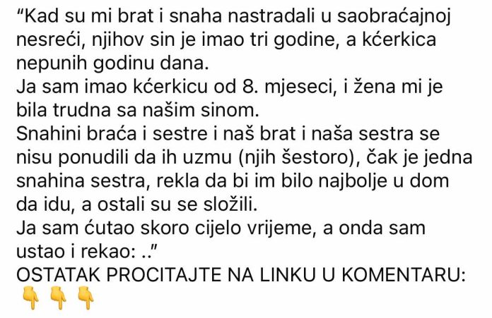 Kada se porodica suoči s tragedijom, prava ljudska veličina često se pokaže kroz postupke, a ne kroz reči. Tako je i u ovoj priči – priča o jednom čoveku koji je, u trenutku kada su svi oklevali, odlučio da preuzme brigu o dvoje malih siročadi i pruži im dom pun ljubavi. Nesreća je odnela život njegovog brata i snaje, ostavljajući iza sebe trogodišnjeg dečaka i bebu od nepunih godinu dana. U tom trenutku, on je već imao malu kćerkicu i ženu trudnu sa drugim detetom, ali nijednog časa nije pomislio da se povuče.