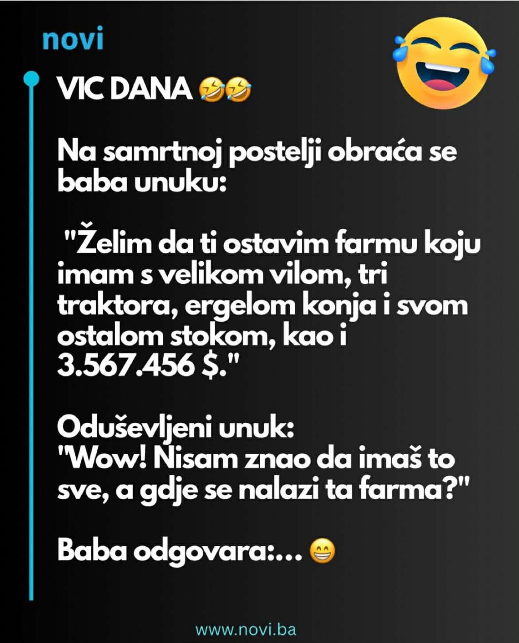 - Na kraju, možda je najveća mudrost ove bake upravo u njenom smijehu. Dok se njen unuk iznenadio „nasljedstvom“, ona je pokazala da ono najvažnije što možemo ostaviti iza sebe nije imovina – već razumijevanje što znači živjeti istinski.