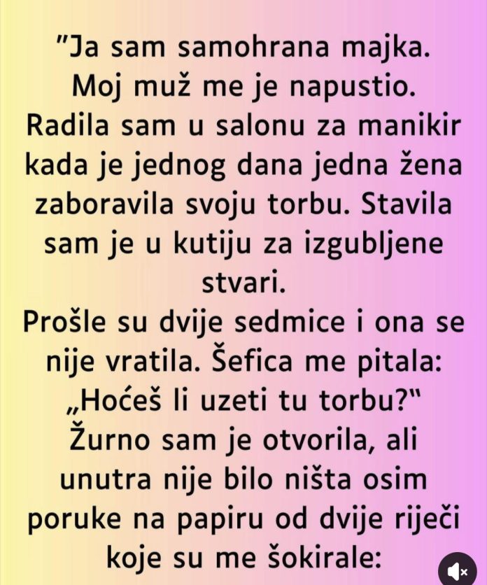 Kada ju je šefica, gotovo usputno, pitala šta misli da urade s torbom, nije očekivala ništa posebno. Radoznalo ju je otvorila, ali unutra nije bilo ni novčanika, ni dokumenata, ni skupih stvari. Samo mali papirić sa dvije riječi: „Za tebe.“ Te riječi su je zbunile više nego da je pronašla novac.
