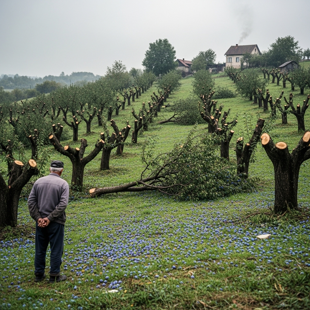 Dragan je bio čovek kojeg su svi u selu poštovali zbog svog predanog rada i ljubavi prema voćnjaku. Njegove šljive su bile najslađe, a njegov trud je donosio plodove koji su bile vredne svakog znoja. Njegovo imanje, smešteno na osunčanoj padini, bilo je mesto ponosa i uspeha. Međutim, uspeh Dragana bio je trn u oku njegovom komšiji Milanu, koji je, za razliku od njega, više voleo da sedi i gleda u tuđe bogatstvo nego da uloži trud u svoj rad.