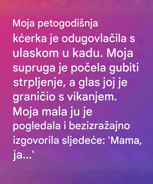 - Upravo jedna takva scena iz porodične svakodnevice pretvorila se u priču koja je mnoge podsjetila na zaboravljene vrijednosti strpljenja, razumijevanja i emocionalne prisutnosti.Radilo se o sasvim običnoj rutini – vrijeme za kupanje. Petogodišnja djevojčica odugovlačila je, hodala sporo i jasno pokazivala da joj se ne žuri u kupatilo