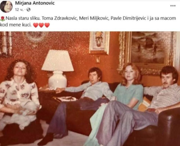 Nedavna objava na njenom Facebook profilu donela je novu pažnju javnosti. Iako je samo podelila staru crno-belu sliku sa nekadašnjim prijateljima i umetnicima, Toma Zdravkovićem, Meri Miljkovićem i Pavlom Dimitrijevićem, ona je zapravo pokazala svu snagu sećanja koja je bila ispunjena ljubavlju, emocijama i životima koji su se preplićući stvarali u njenoj blizini. Ta slika nije samo prikaz prošlih vremena, ona je podsetnik na sve što je Mirjana prošla, ali i na svet umetnika, emocija i borbi koje nisu bile javne, ali su bile stvarne. Ova fotografija s Tomom i drugima nosi u sebi mnogo dublje značenje. To nije samo nostalgična slika, već simbol sveta koji se više ne može ponovo oživeti, ali koji je, u njenom srcu, još uvek prisutan.