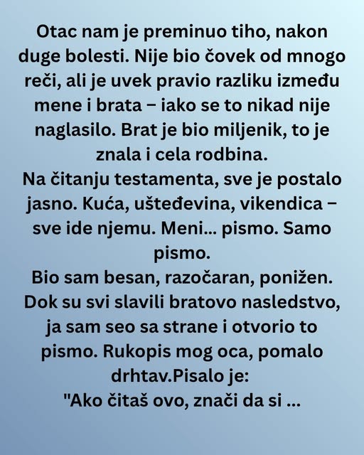 Kada smo se našli na čitanju testamenta, istina koju sam toliko dugo pokušavao da potisnem isplivala je na površinu s bolnom jasnoćom. Sve što je moj otac posedovao – kuća, vikendica, ušteđevina – prepisano je njemu, mom bratu. A meni… meni je ostavljeno samo jedno staro, zapečaćeno pismo. Gledao sam ga u rukama, težine jedne obične hartije, ali za mene je to u tom trenutku bilo kao kamen. Osećao sam se poniženim, besnim, izdanim. Dok je porodica slavila bratovo nasledstvo, povukao sam se u tihu sobu, otvorio omotnicu i pogledao u rukopis koji sam odmah prepoznao – bio je to drhtavi rukopis mog oca.