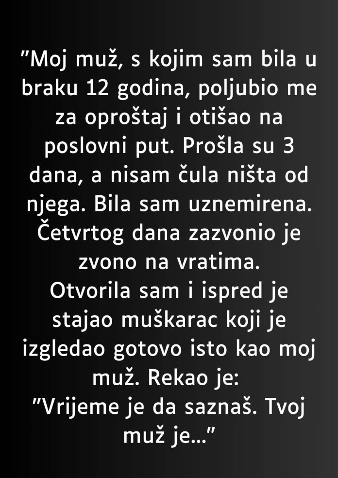 Četvrtog dana, kada je zabrinutost prerasla u strah, zazvonilo je zvono na vratima. Otvorila je bez razmišljanja, nadajući se da je to on, možda s iznenađenjem ili izgovorom. Umjesto toga, ispred nje je stajao muškarac koji je izgledao gotovo identično njenom mužu. Isti hod, isti pogled, isto lice – ali bez topline koju je poznavala.