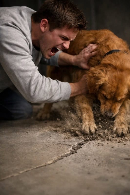 Slušao je duboko grebanje koje dolazi iz podruma, kao da nešto snažno struže po betonskom podu. Uzeo je baterijsku lampu i sišao dole, gde je pronašao Barnabija koji je besno grebao beton, kao da pokušava da dođe do nečega ispod. U trenutku kada je prišao, primetio je krvave tragove na betonu i povređene šape psa. Bio je u šoku, pa je odlučio da ga odvede veterinaru. Međutim, stanje se nije popravilo – svaki put kada bi noću otišao do vrata, Barnabi je počeo da grebe, cvili i uporno pokušava da se domogne nečega u podrumu.