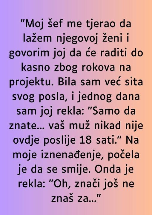 • Naime, osoba koja je ispričala ovu priču radila je za šefa koji je imao vrlo neobičan način provjere odanosti svojih zaposlenika. Njezin zadatak bio je, između ostalog, lagati šefovoj ženi, govoreći joj da će raditi do kasno zbog rokova na projektu, iako je zapravo već bio gotov s poslom. Naravno, to je stvorilo frustracije, jer nije bilo jasno zašto bi netko tražio od nje da laže, posebno o nečemu što nije imalo nikakvog smisla.