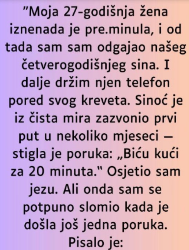 Noći su mu postale najteže. Telefon njegove supruge i dalje je stajao pored kreveta, kao tiha veza s prošlim životom. Bio je to predmet koji je čuvao uspomene, poruke i glas žene koje više nema. Mjesecima se ništa nije dešavalo, sve dok jedne večeri ekran nije zasvijetlio. Poruka je stigla, kratka i jeziva: da će neko doći za dvadeset minuta. U tom trenutku, umjesto nade, osjetio je strah koji mu se uvukao pod kožu.