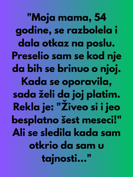 Kada se majka konačno oporavila, nije očekivao ništa zauzvrat – ali ono što je uslijedilo potpuno ga je šokiralo. “Živio si i jeo besplatno šest mjeseci! Sada bi trebalo da mi platiš za to,” rekla mu je hladnim glasom. Te riječi su ga pogodile poput oštrice, ali ni to nije bio kraj njegovom razočaranju.