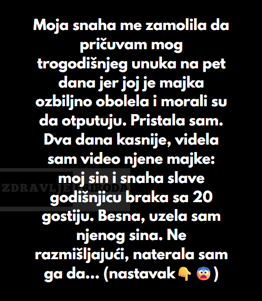 Ali samo dva dana kasnije, dok je na Fejsbuku gledala objave prijatelja, usledio je šok koji nije mogla da zaboravi. Pred njenim očima pojavio se video koji je objavila upravo „bolesna“ majka njene snahe – na snimku se jasno vidi kako njen sin i snaha slave godišnjicu braka okruženi sa dvadeset gostiju, smeju se, nazdravljaju i uživaju u muzici.