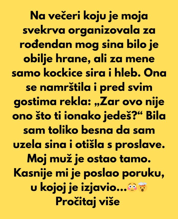 Njegova reakcija da prespava kod majke može biti znak da se osjeća razapet između vas, ali i da još ne uviđa koliko je ponašanje njegove majke bilo povređujuće za tebe. Pokušaj razgovarati s njim mirno, bez optuživanja, i objasniti da nisi otišla da bi “pokvarila rođendan”, nego da zaštitiš svoje dostojanstvo. Možda mu možeš reći nešto poput: “Žao mi je što je sinov rođendan završio ovako, ali bilo mi je nepodnošljivo da me neko pred svima ismijava, a da ti to ne primijetiš.”