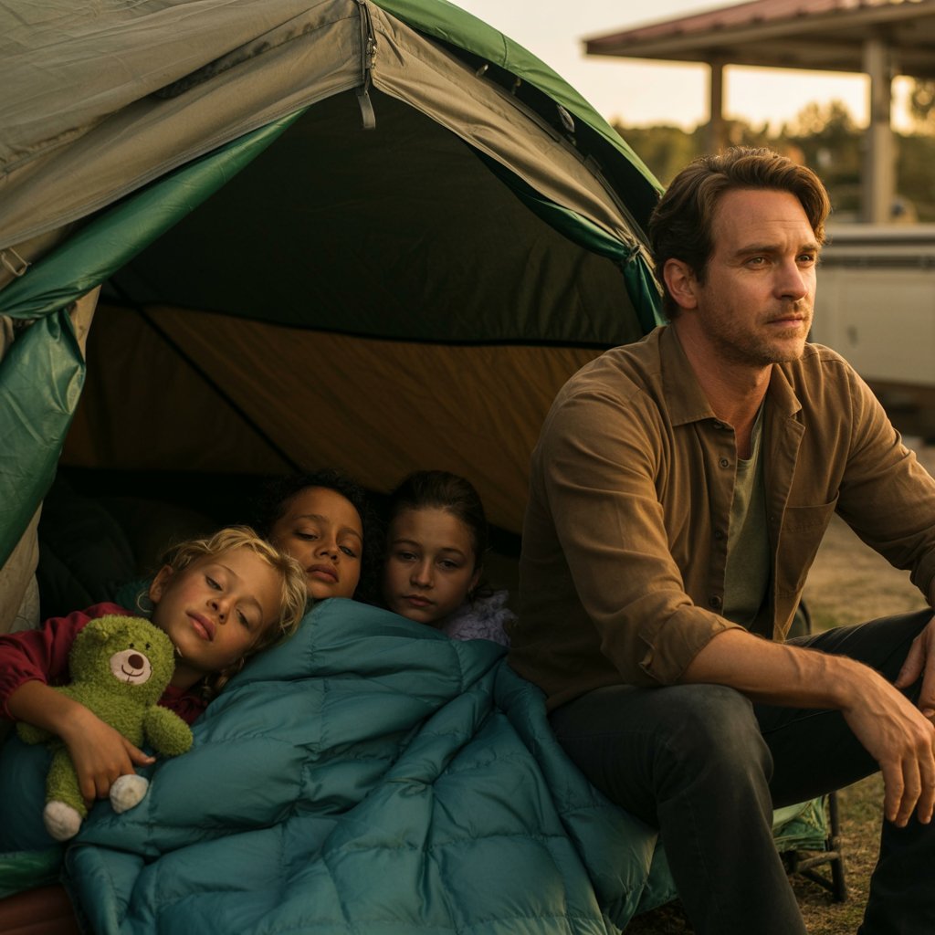 Otac je svako jutro provodio u potrazi za skloništem. Telefonski pozivi završavali su riječima „možda“ i „lista čekanja“. A „možda“ je za njega značilo noći provedene u autu i brigu kako će djeca izdržati hladnoću. Najviše ga je boljelo kada je čuo kako njegov sin u snu šapuće da mu je „ovde ljepše nego u motelu“. To ga je slomilo jer je znao da je u pravu – motel je bio buđav i neprijatan, dok je šator pod zvijezdama makar nudio tišinu i osjećaj slobode.