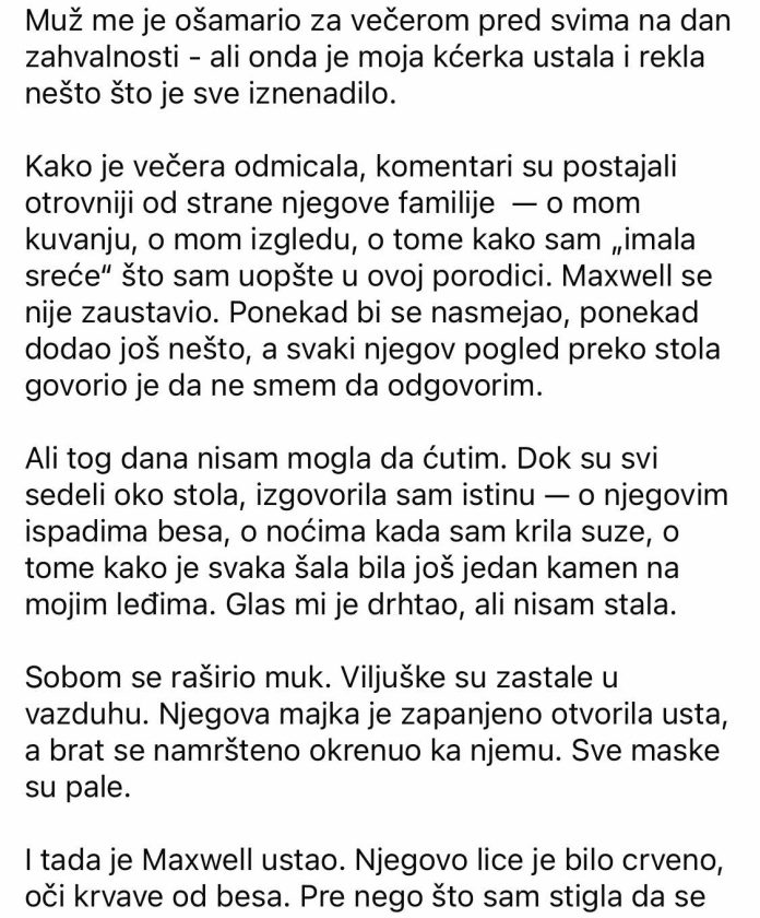 - Osmijesi na licima članova porodice nisu skrivali napetost, a iza „šala“ i ciničnih komentara krila se oštra istina — porodično nasilje koje je godinama bilo zataškavano.Supruga, naviknuta da skriva modrice ispod rukava i da šuti kako bi sačuvala privid mira, te večeri više nije mogla ostati tiha. Dok je devetogodišnja kćerka Emma u uglu pratila svaku riječ, majka je odlučila da pred svima izgovori ono što je nosila u sebi — da iza zatvorenih vrata postoji bol, poniženje i beskrajne noći u tišini. Njene riječi, isprva drhtave, pretvorile su večeru u mukli sudar stvarnosti i poricanja.