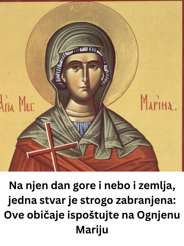 - Iako u crkvenom kalendaru Ognjena Marija nije obeležena crvenim slovom, u narodnoj tradiciji zauzima veoma važno mesto. Svetu mučenicu Marinu, kako joj je crkveno ime, narod doživljava kao čuvaricu ognja i groma, te se veruje da ona istovremeno donosi i blagoslov i kaznu. Povezuju je s prirodnim nepogodama – od požara do suša – i zbog toga se njen dan poštuje s dubokim strahopoštovanjem.