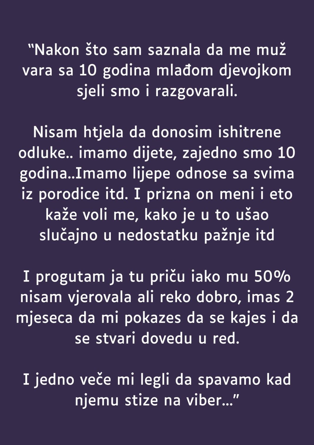 Zatim mi priznaje da me voli, objašnjavajući da je u tu situaciju zapao slučajno zbog nedostatka pažnje, između ostalog. Prihvatila sam tu priču, iako sam vjerovala samo u pola nje, ali mi je rekao da imam dva mjeseca da dokažem svoje kajanje i da sve riješim. Jedne noći, dok smo se smjestili spavati, primio je skrivenu poruku na Viberu. Odmah sam prepoznao da je od nje, ali nisam mogao vidjeti sadržaj.