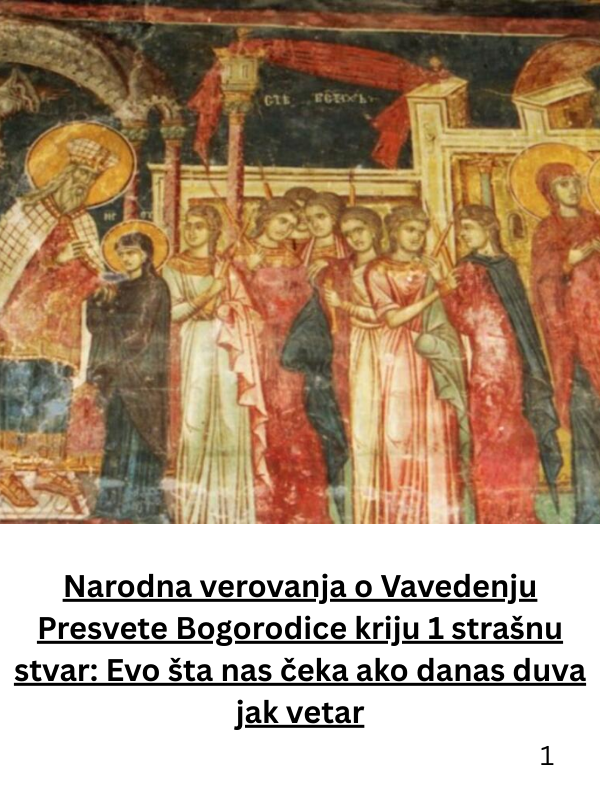 - Ovaj praznik slavi trenutak kada je Bogorodica, kao trogodišnje dete, prvi put uvedena u hram Božji, čime je postala prva zavetovana devica u istoriji hrišćanstva. Pored svog dubokog duhovnog značaja, Vavedenje je i dan bogat narodnim verovanjima i običajima, sa posebnim naglaskom na predskazivanja koja se tiču naredne godine, posebno u pogledu plodnosti i letine.