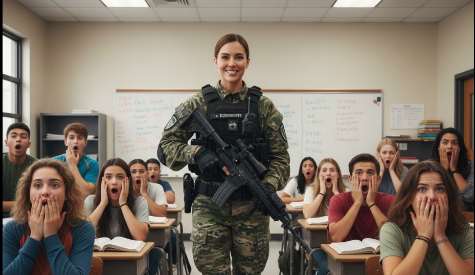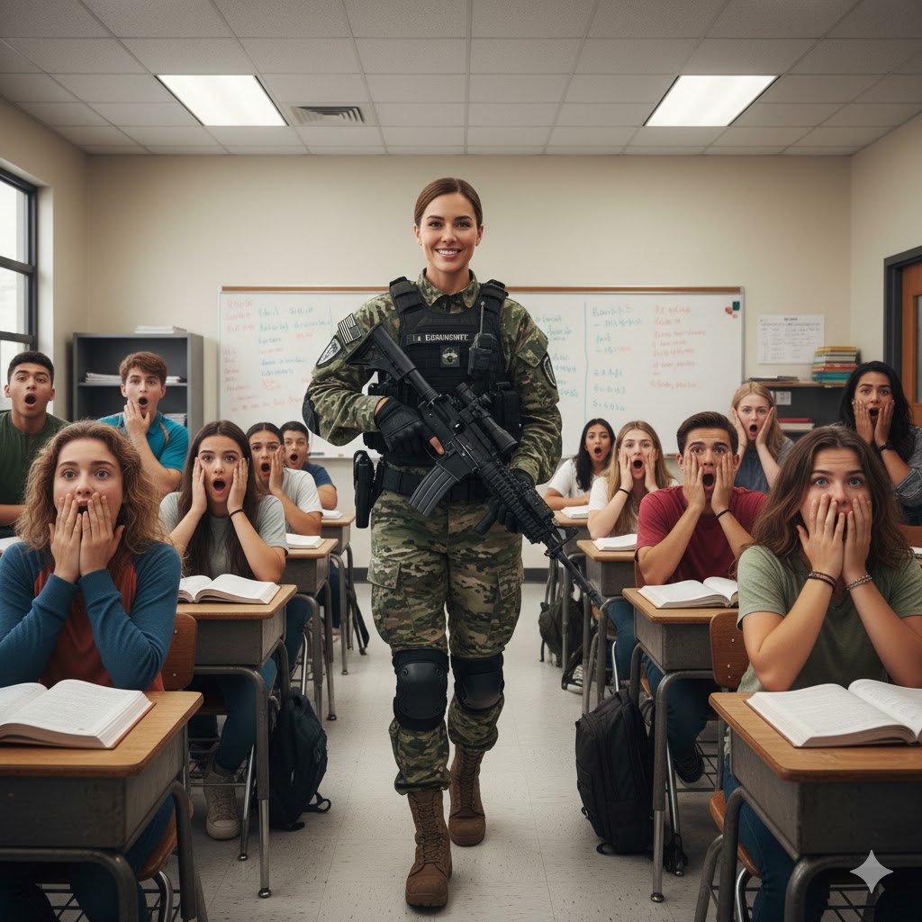- No, ono što će se dogoditi sljedećeg dana, kada nitko nije očekivao, šokiralo je sve. Umjesto uobičajenog alarma za požar, čuo se alarm za zatvaranje škole. U tom trenutku nitko nije mogao naslutiti što dolazi. Na vrata učionice ušlo je šest vojnika u punoj taktičkoj opremi, njihov korak bio je ozbiljan i snažan, odjekivao je hodnicima škole. Svi su ostali zapanjeni i prestrašeni. Kad su vojnici ušli u učionicu, zapovjednica je podigla vizir svoje kacige, a scena koja je uslijedila bila je trenutak koji nitko u toj prostoriji nikada neće zaboraviti.