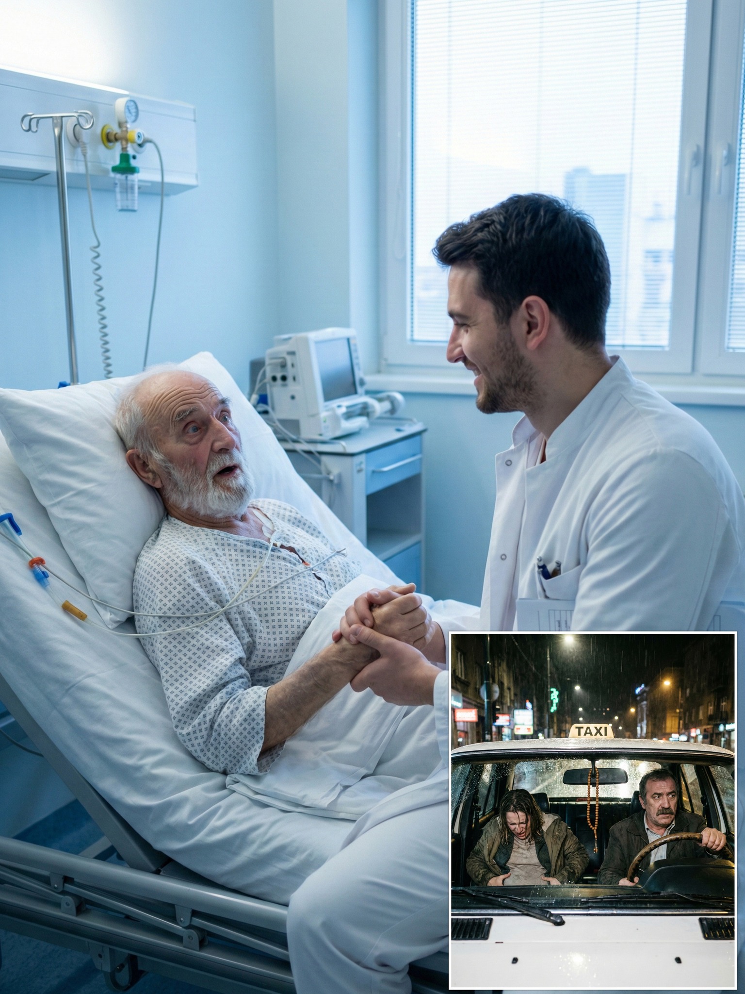 Vrata su se otvorila i ušao je mlad, ozbiljan ljekar. Uzeo je karton, pročitao ime i prezime, pa dugo gledao starca ispred sebe. Upitao ga je da li je nekada bio taksista i da li je vozio bijelog “Mercedesa” s tespihom na retrovizoru. Ibro se zbunio, ali je potvrdio. Tada se doktorovo lice promijenilo. Sjeo je na ivicu kreveta, što se rijetko viđa, i tiho rekao da zna tu priču jer mu je majka pričala cijelog života o jednoj olujnoj noći i taksisti koji je vozio kao lud da bi on došao na svijet.