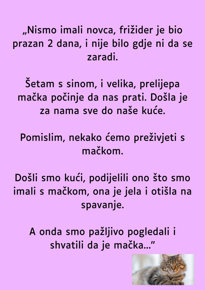 - Život često iznenadi baš onda kada čovjek pomisli da je dotakao dno. Dani bez novca, s praznim frižiderom i bez ikakve mogućnosti da se zaradi, bili su test snage jedne porodice. Otac i njegov sin, umorni od briga i besciljnog traženja izlaza, odlučili su barem prošetati, nadajući se da će kretanje ublažiti težinu na ramenima. U tim trenucima kada čovjek nema ništa, i najobičniji susret može promijeniti tok misli. Na ulici ih je dočekala velika i neobično lijepa mačka. Nije se plašila, nije oklijevala – jednostavno je krenula za njima, kao da je oduvijek pripadala njihovom svijetu.