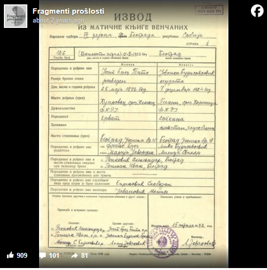 • Venčani list, koji bi trebalo da bude samo formalni dokument, pokazao se kao izvor mnogih pitanja. Zašto je datum rođenja promenjen? Zašto je zanimanje ostalo prazno? Da li je to bila birokratska omaška ili svesna odluka? I koliko su uopšte građani tada znali o privatnom životu čoveka koji je decenijama upravljao državom?