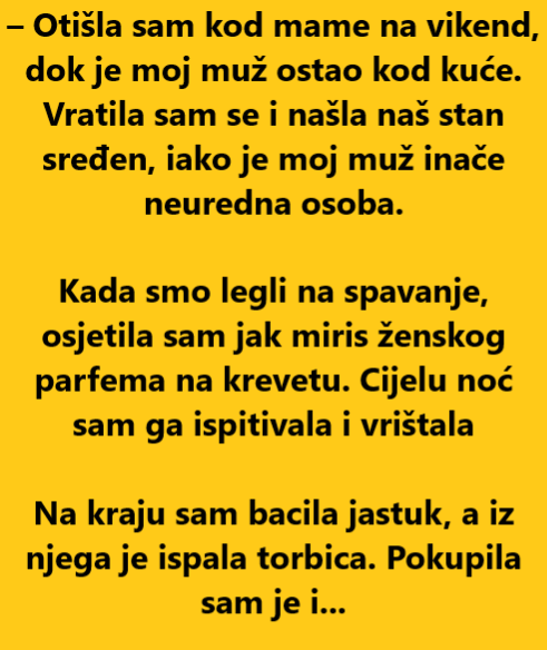 Ali, kako to obično biva, sreća nije dugo trajala. Kada smo legli na spavanje, u trenutku dok sam se nameštala na jastuk, osetila sam jak miris ženskog parfema. Bio je toliko intenzivan da mi je odmah probudio sumnju. Srce mi je počelo da lupa, u glavi su mi se rojile misli: „Da li je neko bio ovde dok me nije bilo? Da li je doveo drugu ženu u naš krevet?“