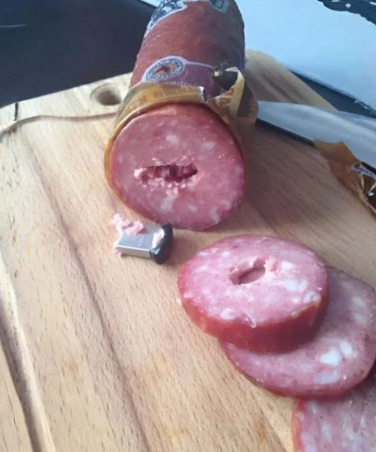Po dolasku kući, umotala je kobasice u papir i pripremila brzinski sendvič. Sve je bilo uobičajeno — okus tipičan, pakovanje uredno, cijena sasvim redovna. Ostatak je ostavila za sljedeći dan. No, kada je sutradan odlučila napraviti omlet, dogodilo se nešto neočekivano. Dok je nož prelazio kroz meso jedne od kobasica, naišao je na nešto tvrdo. U početku je pomislila da je to možda zadebljanje ili neka žilica. Ali kada je pažljivije pogledala, ostala je zatečena — iz srži kobasice virio je USB uređaj, prekriven slojem masnoće i mljevenog mesa.