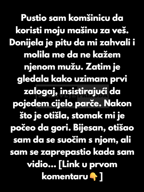Priča počinje kao obična susedska situacija. Jedan mali, naizgled beznačajan gest — dopuštanje komšinici da koristi mašinu za veš. Za većinu ljudi, ovo bi bila sasvim normalna stvar. Ali, kako to često biva, iza tih malih gestova mogu se skriviti dublje emocije i neizgovorene reči. Komšinica, zahvaljujući na ljubaznosti, donosi pitu kao znak zahvalnosti. Iako ovo zvuči kao uobičajeni postupak, nešto u njenom ponašanju odmah nije bilo kako se očekivalo. Njena molba da njen muž nikako ne sazna za to odmah je ukazivala na nešto više, nešto što je ostalo neizgovoreno. Nije to bila samo želja za diskrecijom, već osjećaj straha, nelagode koji je stajao iza tih jednostavnih reči.
