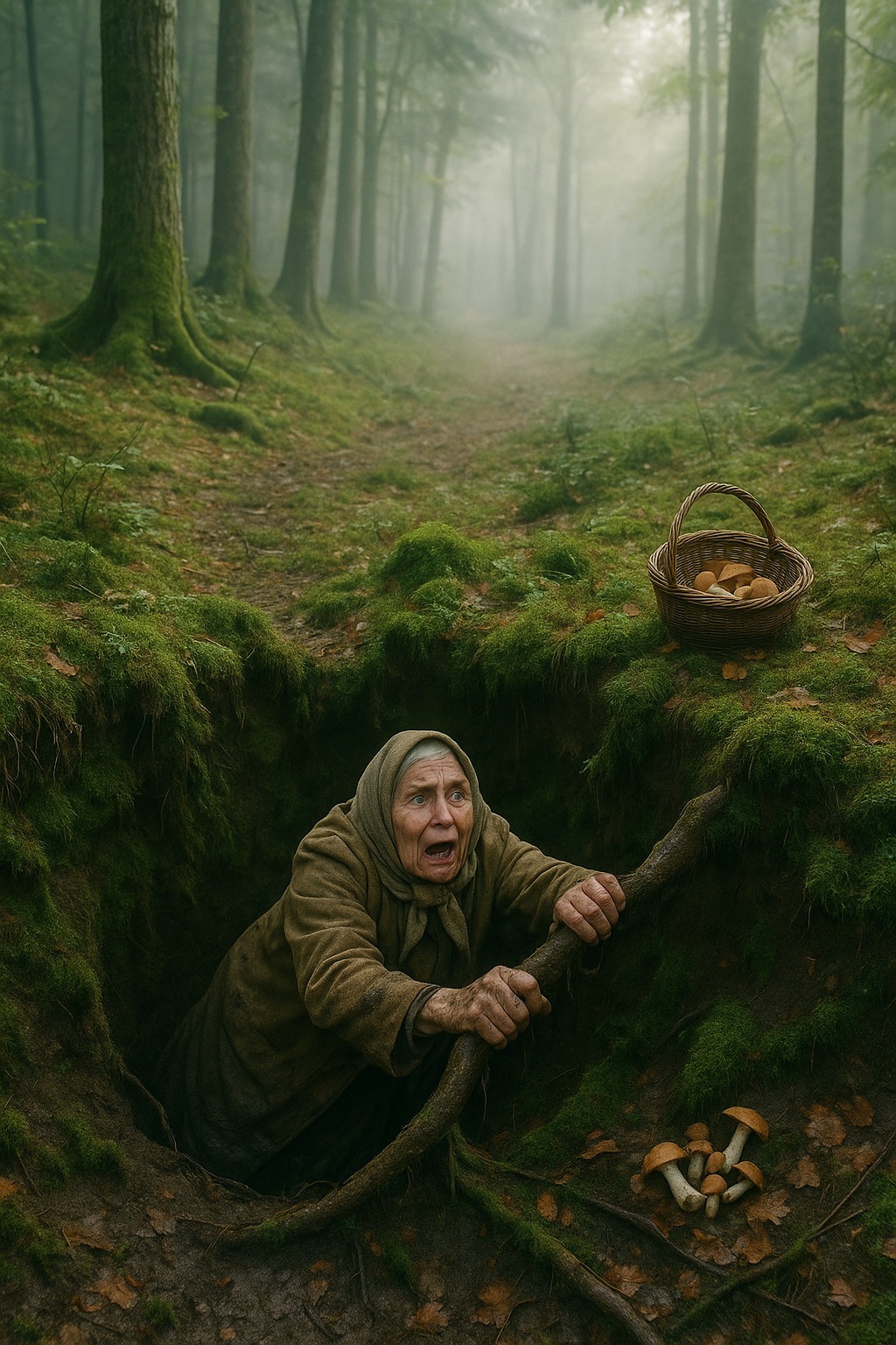Pokušala je ustati, ali noga ju je boljela. Shvatila je da je upala u jamu duboku nekoliko metara. Zidovi su bili puni korijenja i vlažne zemlje. Pozvala je upomoć, ali odgovorila joj je samo jeka. Šuma, koja je inače disala s njom, sada je bila nijema.