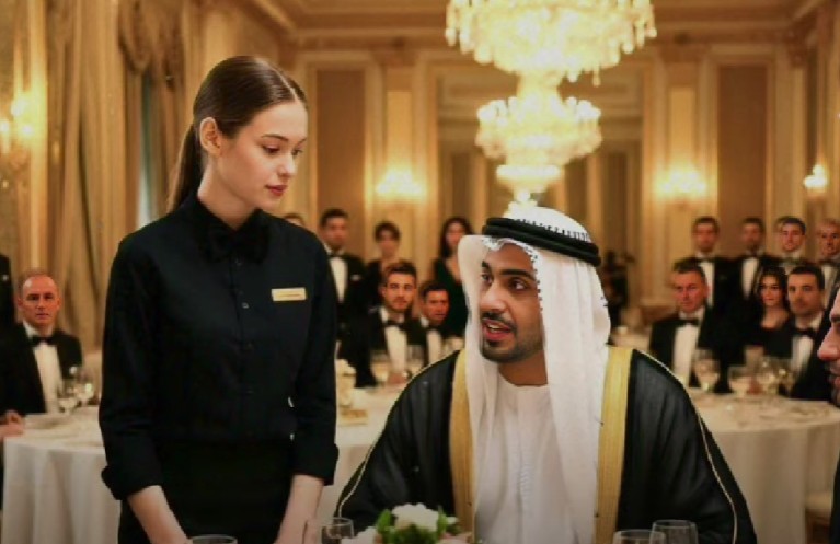 Sedeći za stolom, šejk je na arapskom jeziku izgovorio uvredu: „Ovaj zapadni konobar čak nije dostojan da dodirne moju dragocenu čašu svojim prljavim rukama.“ Smeh je ispunio prostoriju, dok je konobarica stajala nepomično, verujući da on neće razumeti njene misli. Ali kada je, bez ikakve reakcije, postavila tacnu na sto, okrenula se prema šejku i izgovorila nešto što je šokiralo sve prisutne: „Ko ponižava ženu za svojim stolom, ponižava svoj ugled pred gostima.“