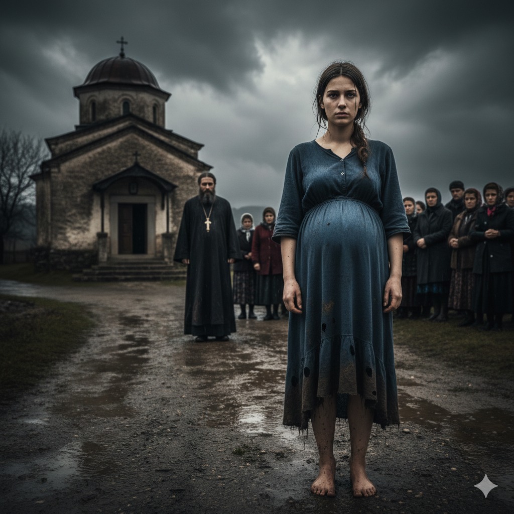 Zaljubila se, ostala trudna i umesto da pronađe podršku, naišla je na osudu. Otac Gavrilo, sveštenik u njihovom selu, izgovorio je pred svima oštre reči, proglašavajući je „grešnicom” i „sramotom”. Njegove reči bile su presudne, a pogledi svih okupljenih u crkvi bili su usmereni prema njenom trudničkom stomaku, dok je ona stajala bez moći da se brani. Nema više ljubavi, nema više sigurnosti – samo javna osuda.