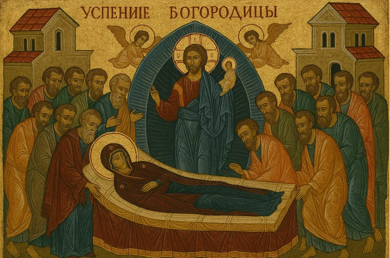 Bogorodica je želela da još jednom vidi sve apostole, a Gospod joj je ispunio tu želju – apostoli su, nošeni anđelima i oblacima, stigli u dom na Sionu, gde je Bogorodica preminula u njihovom prisustvu. Apostoli su zatim odneli kovčeg s njenim telom na Getsimanski vrh, ali kada je apostol Toma trećeg dana stigao da je celiva, u kovčegu je zatekao samo plaštanicu. Istovremeno, Bogorodica im se javila i poručila: „Radujte se, ja ću biti s vama zauvek.“