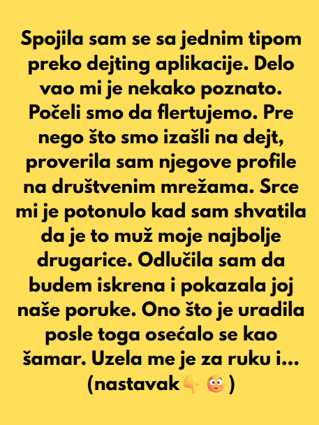 - Povukla je ruku, ustala i gledala me sa nekom vrstom prezira koju nikada ranije nisam vidjela kod nje. “Daj, molim te. Vidjela sam milion puta kako ga gledaš. Gledaš sve što je moje. Možda je vrijeme da se mi dvije udaljimo. Ovo mi ne treba.”I otišla je. Bez vike, bez suza. Samo je nestala. A ja sam ostala da sjedim – zbunjena, slomljenog srca, bez daha. Mislila sam da će me istina spasiti, da će naše prijateljstvo biti jače od jedne nesrećne priče sa aplikacije.