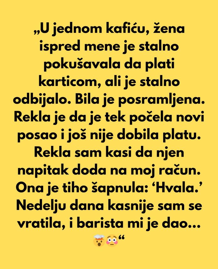 Sedmicu dana kasnije, ista žena se vratila u isti kafić. Ni po čemu nije bilo posebno jutro – sve dok joj barista nije pružio besplatni latte. Uz njega je bila zalijepljena mala poruka, napisana urednim rukopisom: