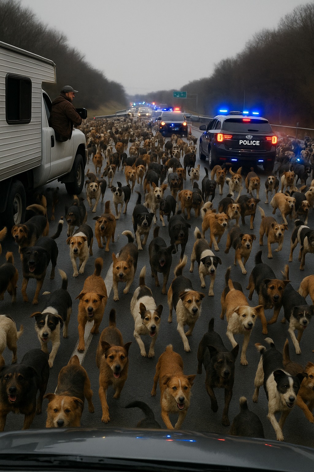 Dan je počeo kao i svaki drugi, a onda je sve krenulo u potpuno nepredvidivom smeru. Dva vozača su se sudarila pokušavajući da izbegnu psa koji je iznenada istrčao na put. Nisu ni uspeli da završe sa dokumentovanjem nesreće, kad se još jedan pas pojavio na autoputu. Zatim, ubrzo, još jedan, pa još nekoliko. Za nekoliko minuta, autoput je bio potpuno blokiran sa stotinama pasa koji su trčali u svim pravcima, ometajući saobraćaj i stvarajući haos.