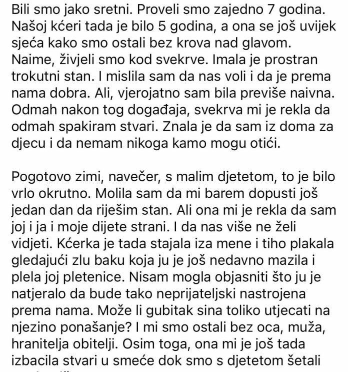 - Život kod svekrve isprva se činio podnošljivim. Prostran stan u kojem su živjeli davao je osjećaj sigurnosti, a žena je mislila da je s partnerovom majkom u dobrim odnosima. No, ubrzo je uslijedilo razočaranje koje je promijenilo sve. Svekrva je, bez imalo milosti, izbacila nju i petogodišnju djevojčicu iz stana, ne mareći za zimu i hladnoću. Njene riječi bile su oštre i neprijateljske: majka i dijete proglašeni su „strancima“.