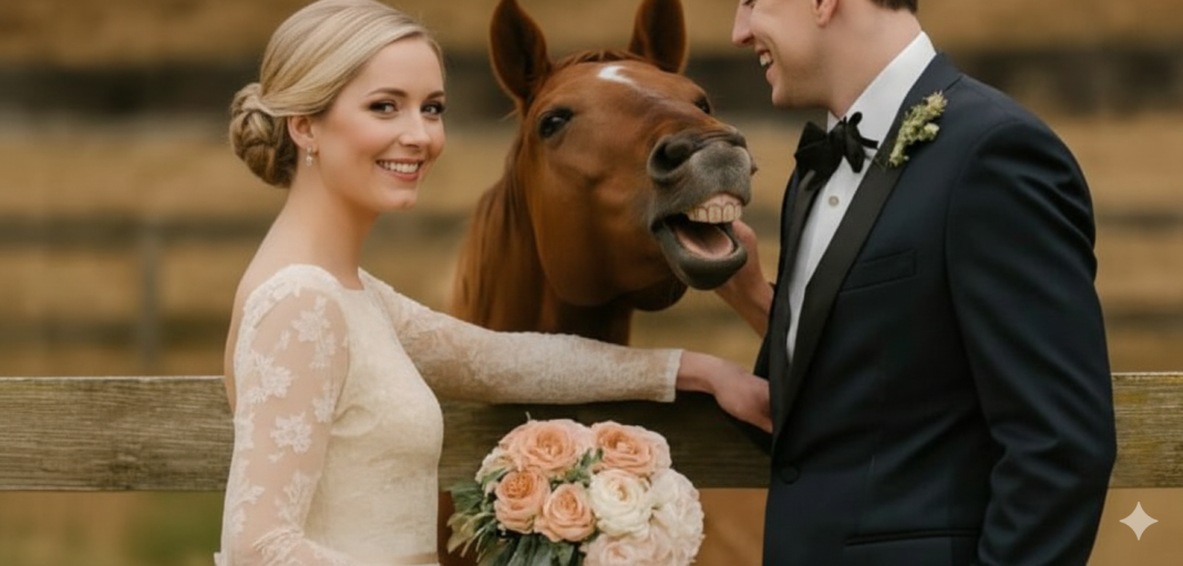 Njena ideja da konj bude prisutan na svadbenim fotografijama isprva je iznenadila njenog verenika, ali kasnije je, uz šalu, priznao da misli da će slike izgledati romantično i posebnu. Venčanje se održalo u seoskoj kući, gde je sve bilo spremno: dekoracija, cveće, gosti, a konj u svojoj punoj lepoti stajao je pored ograde. Mlada ga je pažljivo pomilovala i šapnula mu nešto na uvo, a konj je, iznenada, počeo da se ponaša vrlo čudno. Umesto da mirno stoji, kako je to bilo očekivano, konj je počeo da frka, udara kopitima i, što je najvažnije, naglo je ugrizao njenog verenika za rukav.