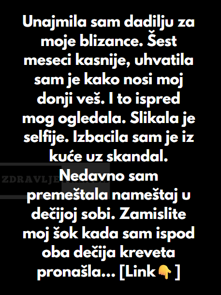 Nedavno sam, sasvim slučajno, odlučila premjestiti krevetiće u dječijoj sobi. Bila sam usred reorganizacije kada sam, pomjerajući jedan krevet, ugledala nešto što me sledilo. Ispod kreveta, pažljivo sakriven, nalazio se moj donji veš – isti onaj za koji sam bila uvjerena da sam ga dadilji dala kada je otišla. Zastala sam, srce mi je ubrzano kucalo, a glavom su mi počela prolaziti pitanja na koja nisam željela odgovore. Kada sam zavirila ispod drugog kreveta, prizor je bio isti. Tamo je bio još jedan komad mog donjeg rublja.