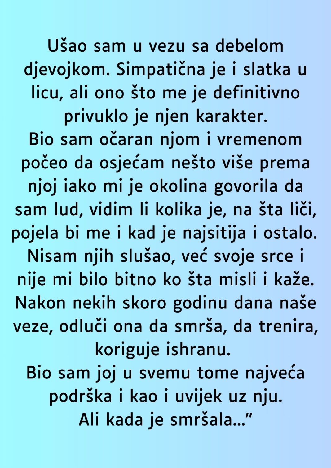 - Njihova veza trajala je gotovo godinu dana kada je ona donijela odluku koja će promijeniti sve – odlučila je da smrša. Počela je da trenira, mijenja ishranu, ulaže u sebe, i on je bio uz nju u svakom koraku, s iskrenom podrškom i ponosom. Gledao ju je kako napreduje, kako se mijenja, kako se bori i pobjeđuje svoje slabosti. On je vjerovao da su te promjene dio zajedničkog puta, a ne početak udaljavanja.