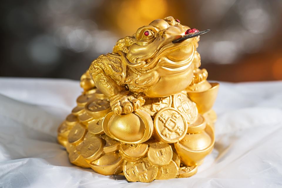 - Još jedan poznati simbol u kineskoj kulturi je žaba sa tri noge i novčićem u ustima. Obično se postavlja blizu ulaza u kuću, ali tako da gleda ka unutra, što simbolično znači da novac „ulazi“ u dom. Novčić u njenim ustima se povremeno pomjera ili mijenja kako bi se „hranila“ i obnavljala energija prosperiteta. Vjeruje se da ona ne samo da privlači novac, već i pomaže da se zadrži, što je jednako važno.